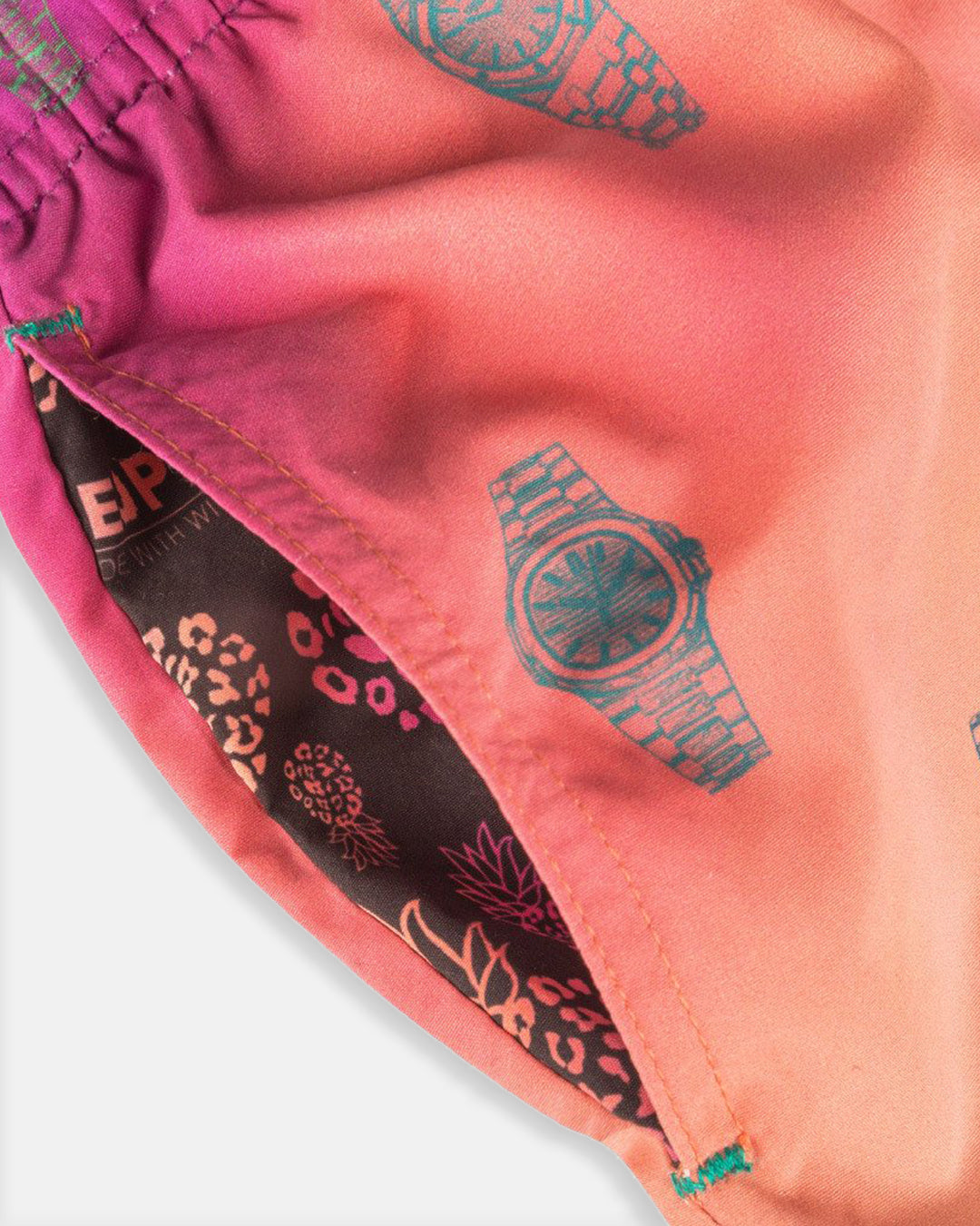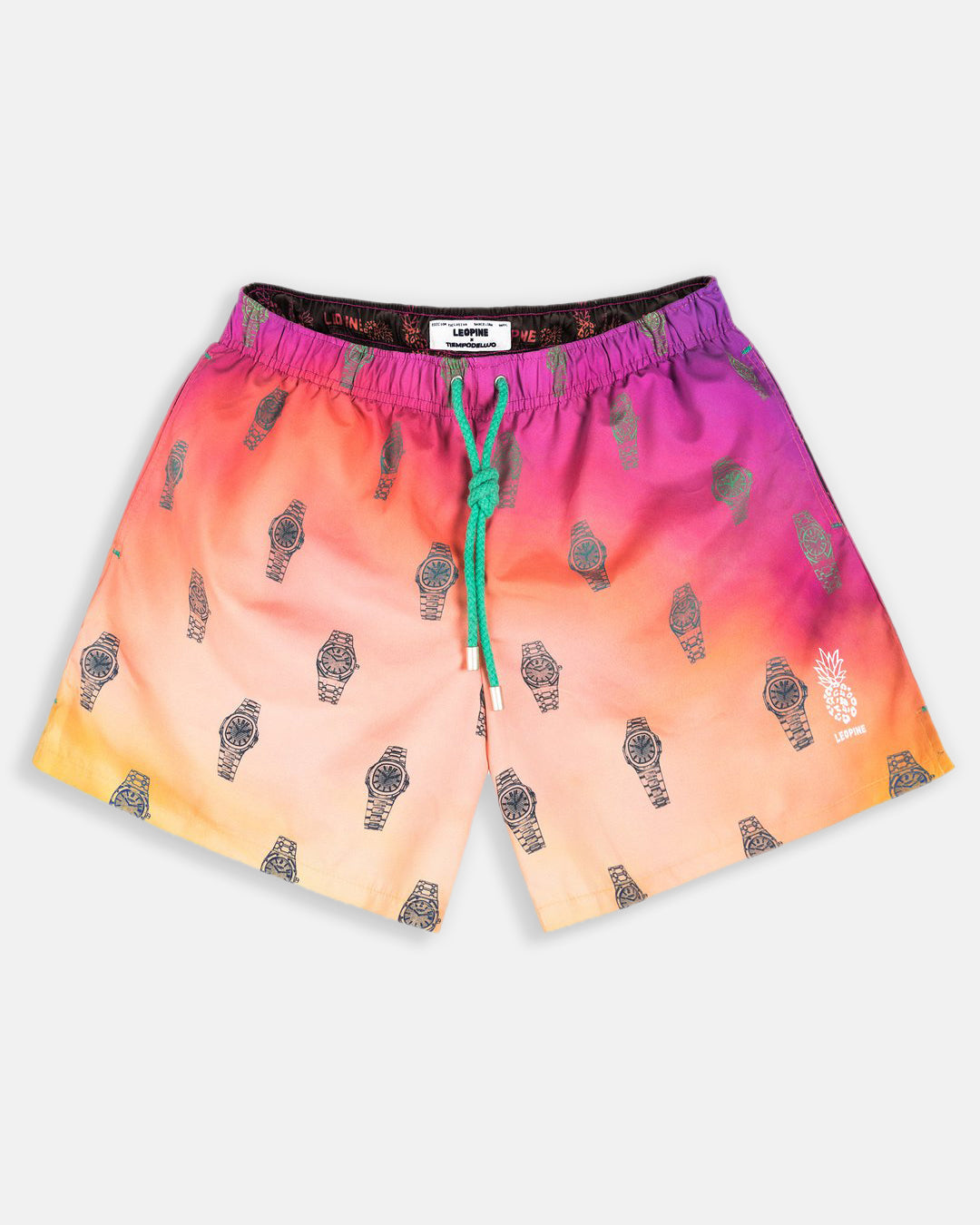 This model incorporates the watch design all over the swimsuit highlighted by the contrast with the background of a Mediterranean sunset. A lively and colourful swimsuit with a decidedly young character.