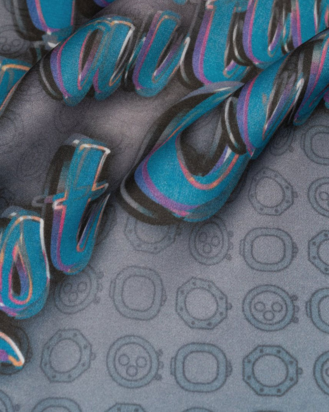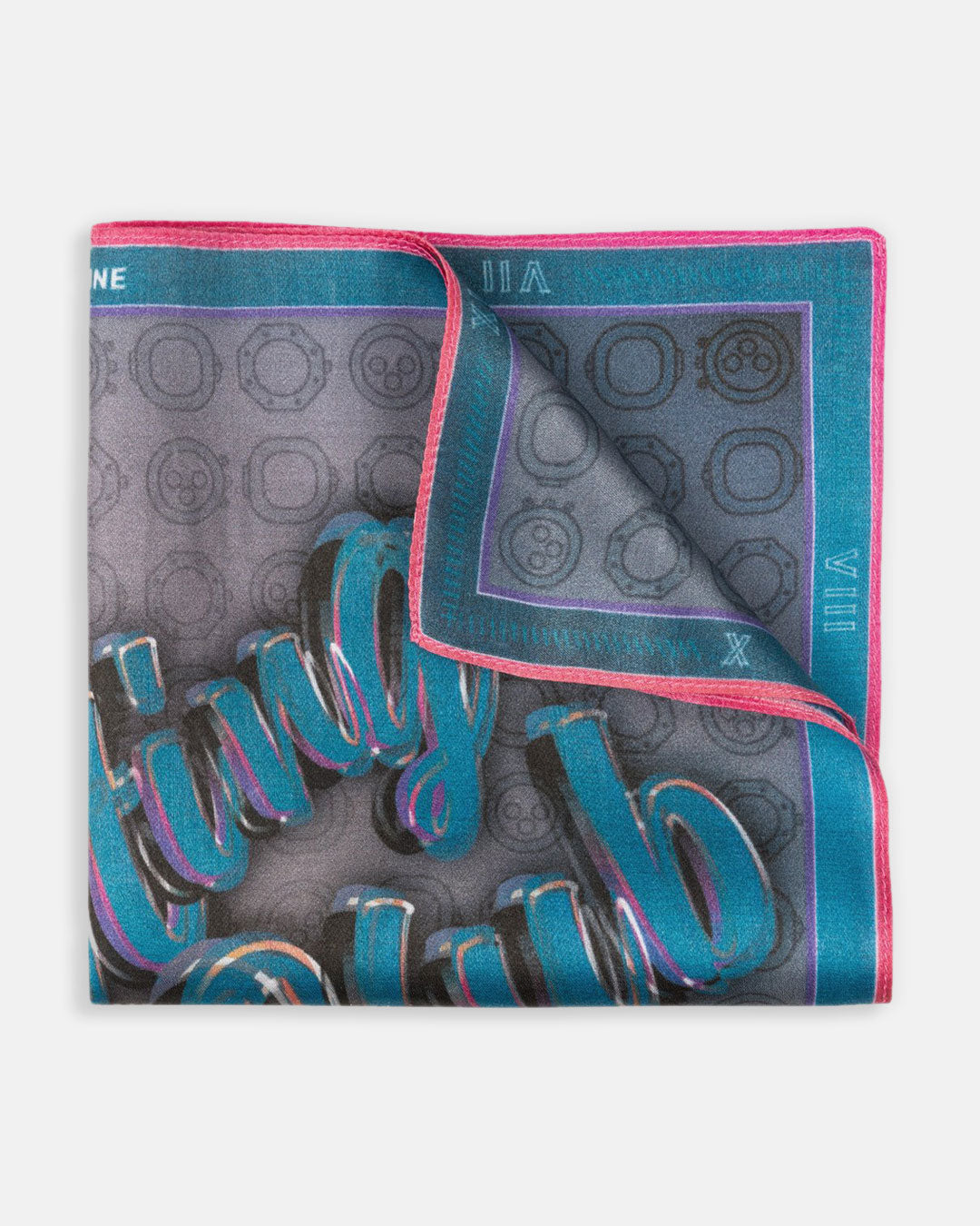 The aesthetics of the pocket square receives a modern and fresh design with handwritten letters in vivid colours. The frame with the hours of the clock is an unmistakable nod to our great passion.